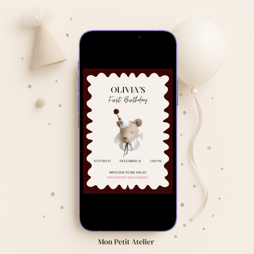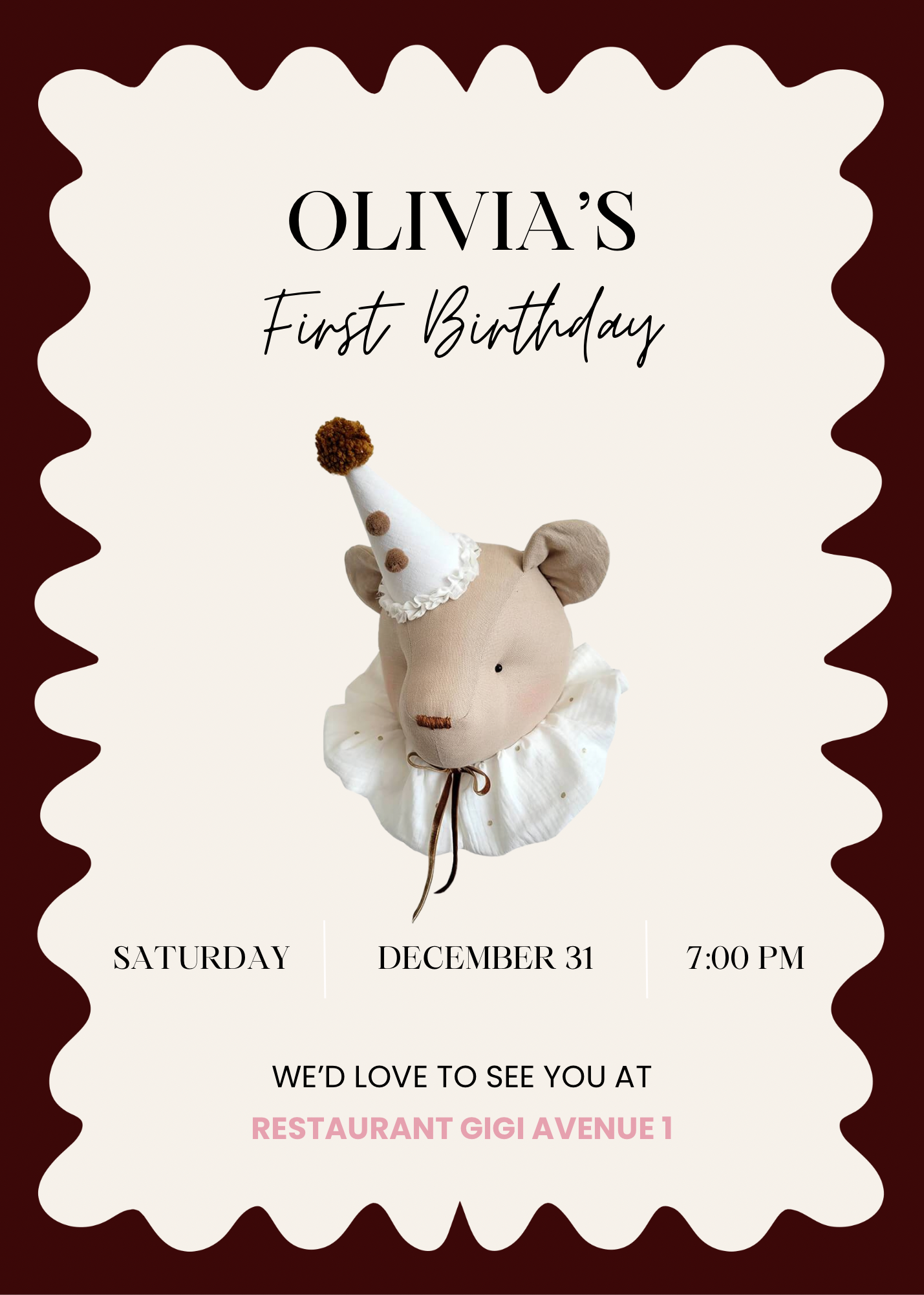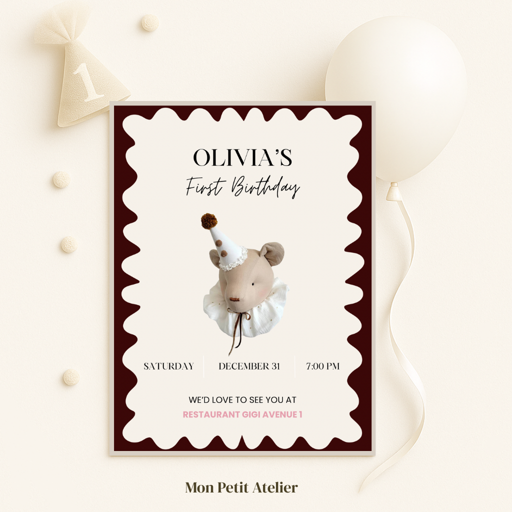 Maak het eerste verjaardagsfeestje van jouw baby écht onvergetelijk met een uitnodiging die net zo bijzonder is als hij of zij. Elk ontwerp is met liefde gemaakt in stijl — zacht, modern en perfect afgestemd op jouw thema.