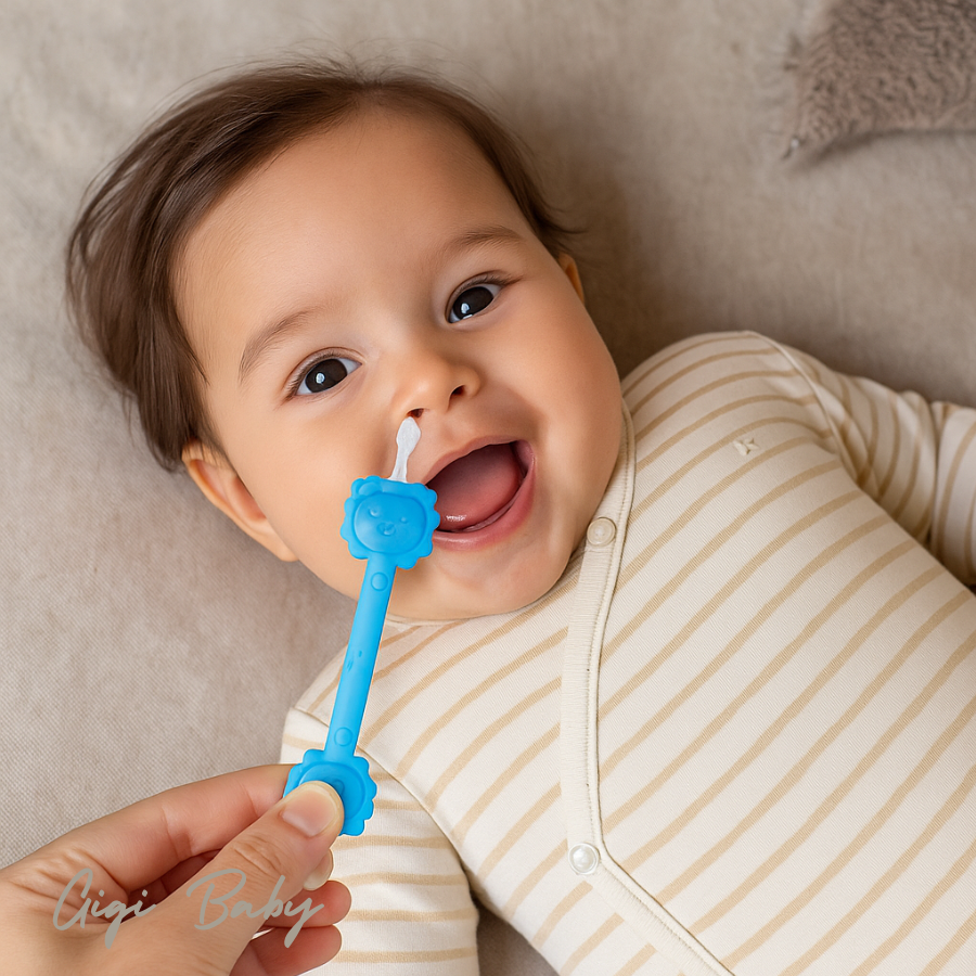 De Snottie Stick verwijdert veilig en zacht opgedroogde snotjes uit het neusje van je baby — zonder irritatie of gedoe.