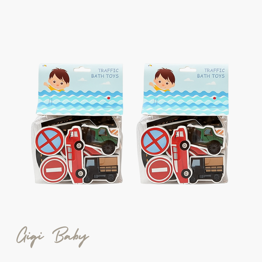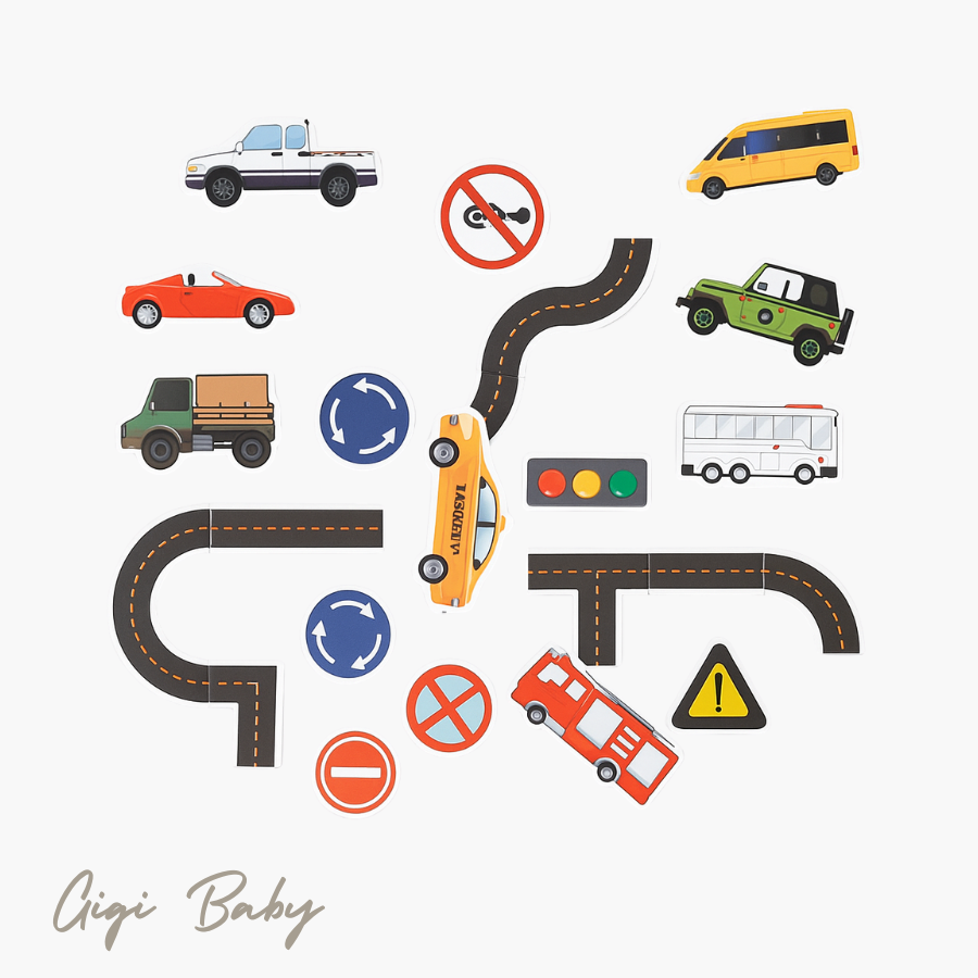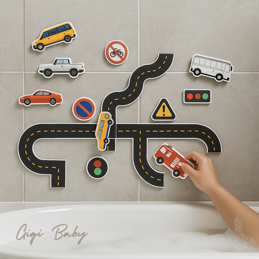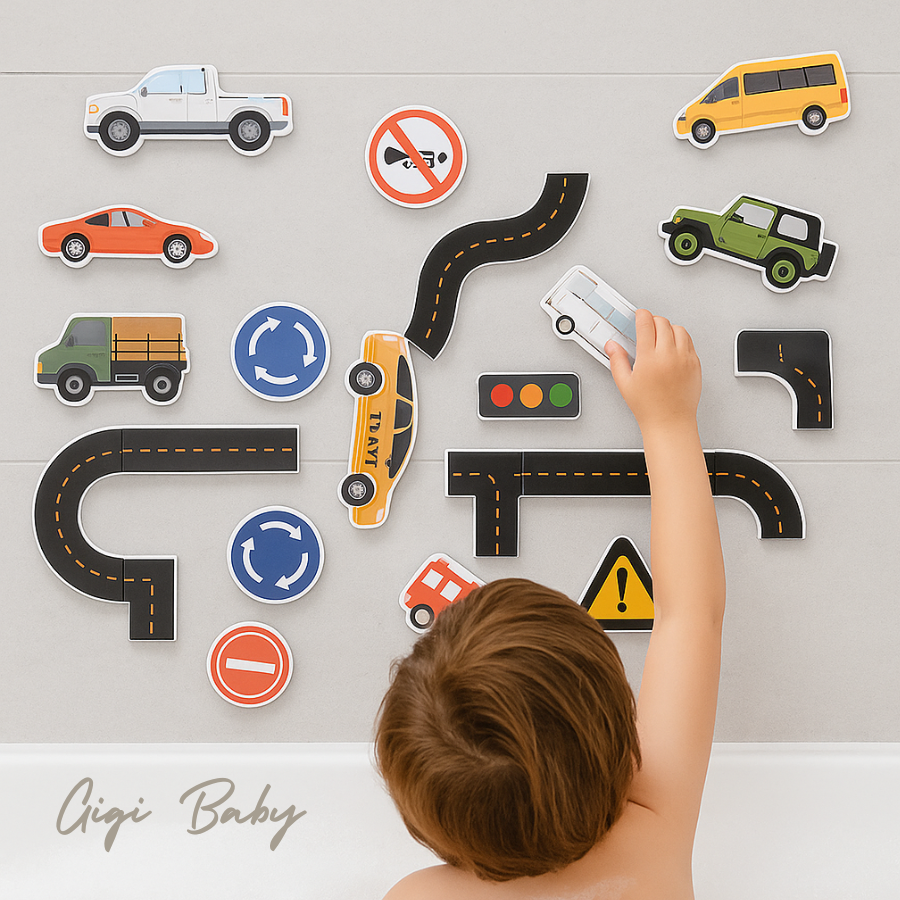 De vrolijke autootjes, verkeersborden en wegdelen blijven plakken op tegels of badwanden zodra ze nat zijn — perfect voor kleine ontdekkers die dol zijn op auto's!